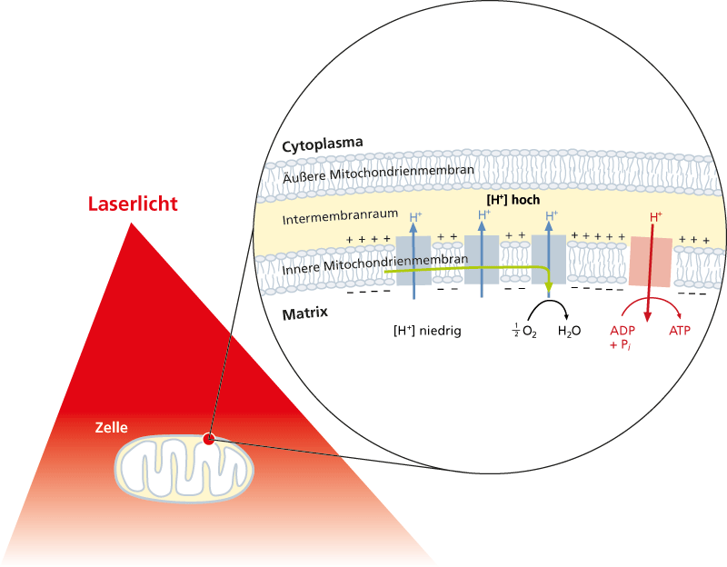 Durch die Bestrahlung mit Licht in dieser Wellenlänge werden die Mitochondrien stimuliert, die eine wesentliche Funktion beim Stoffwechsel und der Energiebereitstellung haben. Mittels Zellkulturen konnte festgestellt werden, dass die darin enthaltenen Cytochrome und Flavoproteine aus den Enzymkomplexen der Atmungskette in erster Linie als Photorezeptoren fungieren. Die Bestrahlung mit rotem Laserlicht der Wellenlänge 650 nm optimiert die oxidative Phosphorylierung des ADP zu ATP.